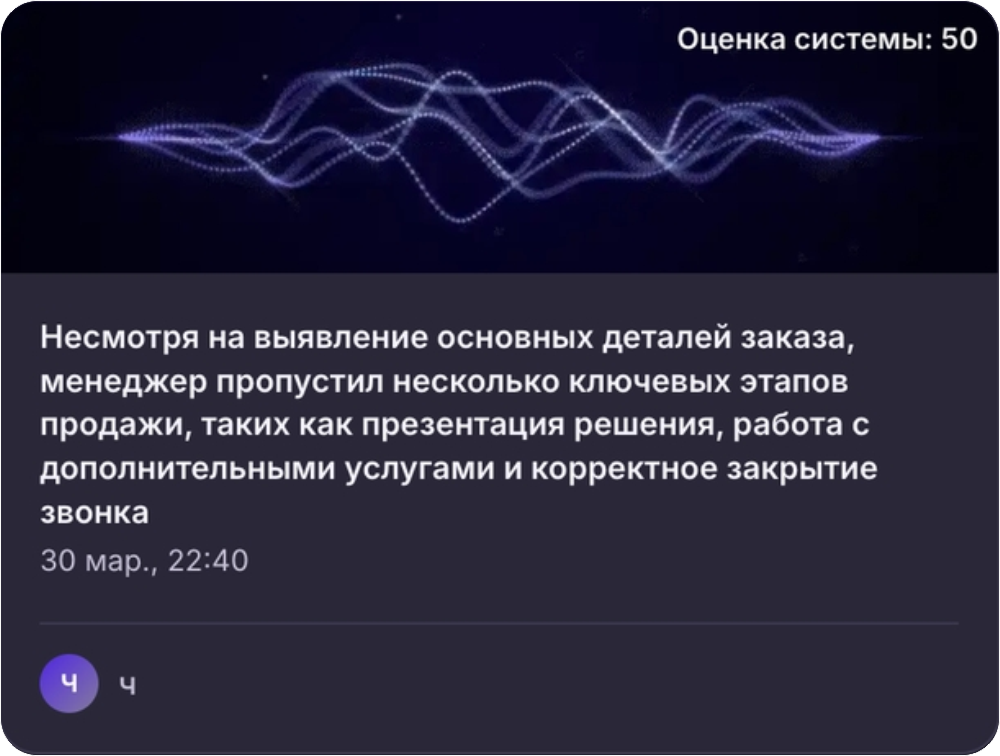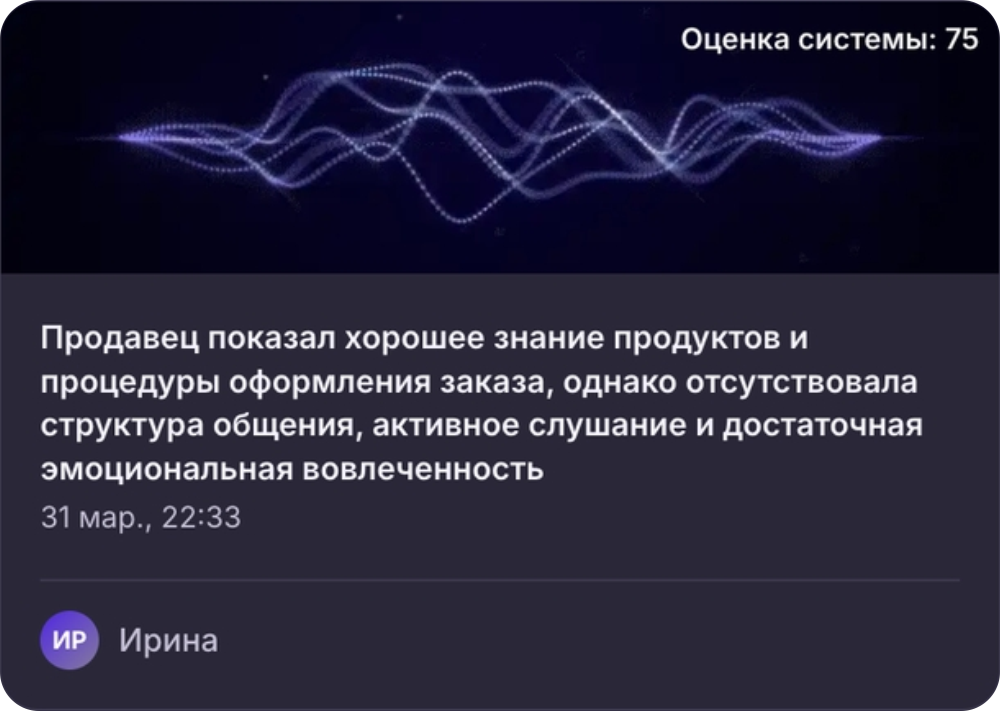 Сразу после разговора менеджер получает пуш-уведомление с оценкой. Система подсветит сильные стороны диалога и даст точную подсказку, как дожать клиента в следующий раз.